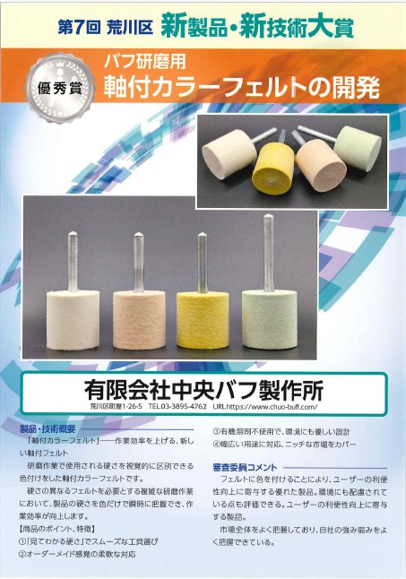 荒川区内中小企業者が開発した優れた新製品・新技術を表彰する「第7回荒川区新製品・新技術大賞」で、新製品【軸付カラーフェルト】が優秀賞を受賞しました。新製品開発に助力頂きました、山形大学サテライト様、...